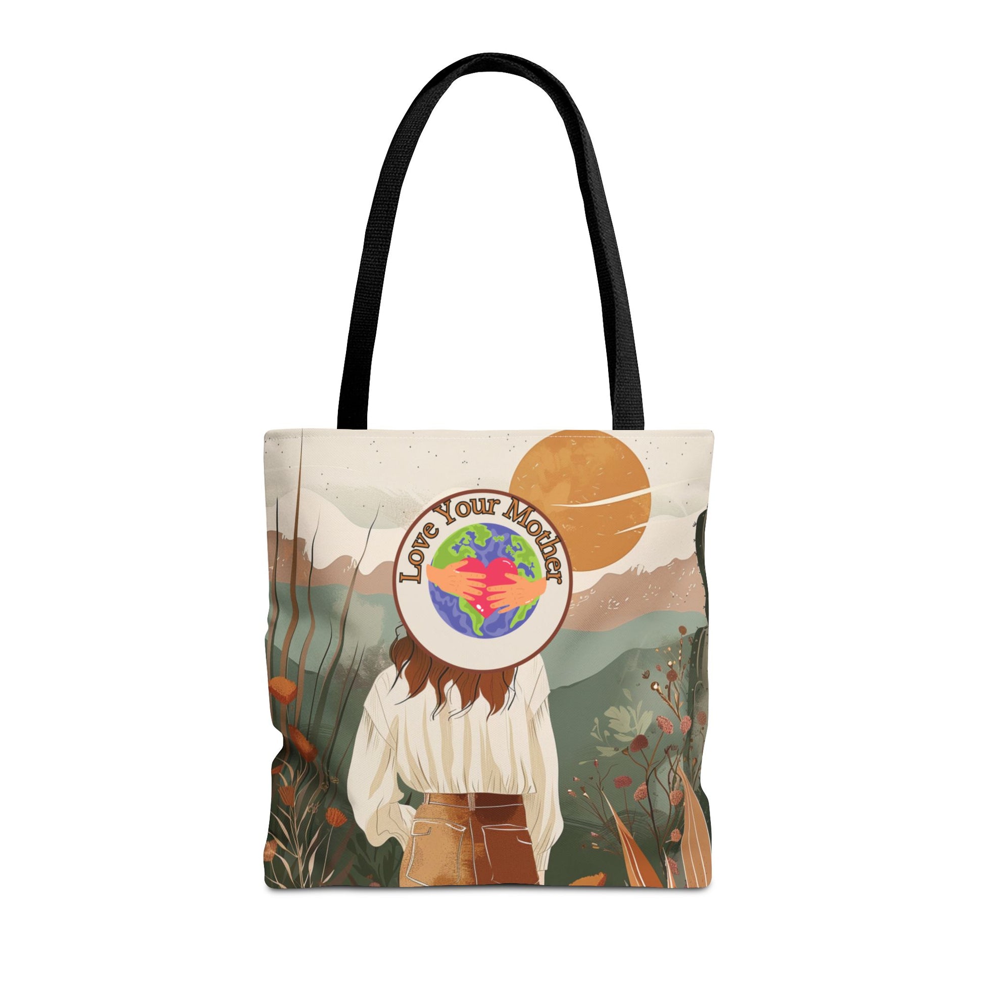 This eco-friendly tote bag will allow you to carry the spirit of Earth Day with you wherever you go. Its creative design depicts a woman in a flowery meadow beneath a bright sun, topped with the fun "Love Your Mother" Earth emblem. Earthy greens, rust orange, warm peach, and gentle neutrals create a tapestry of natural beauty, representing feminine strength and our love for Mother Earth.
