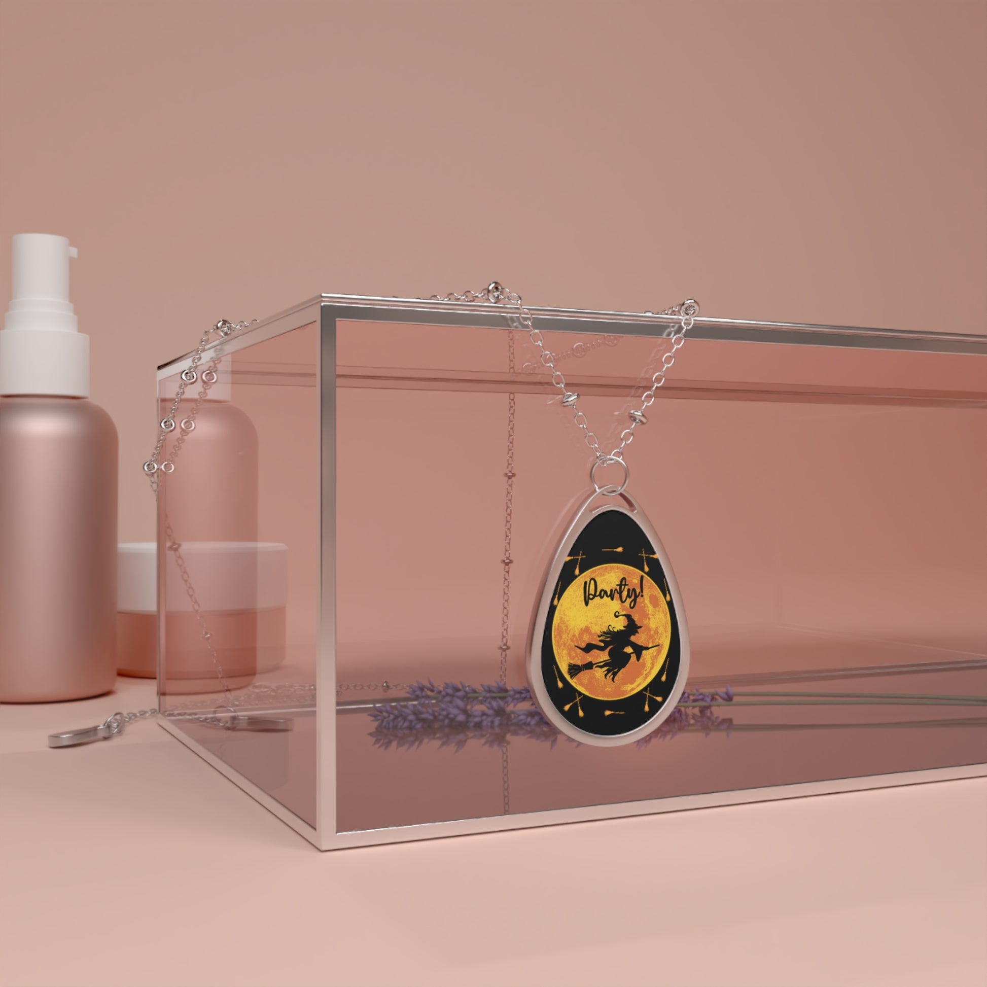 Elevate your Halloween enchantment with this captivating necklace showcasing the mystical silhouette of a witch poised upon a radiant yellow-orange moon. This pendant plainly illustrates the season's festivities with a witch poised on her broom surrounded by whimsical broomsticks dancing in a celestial orbit around the moon. This is a wearable piece of art that showcases the perfect blend of Halloween magic and mysterious elegance.