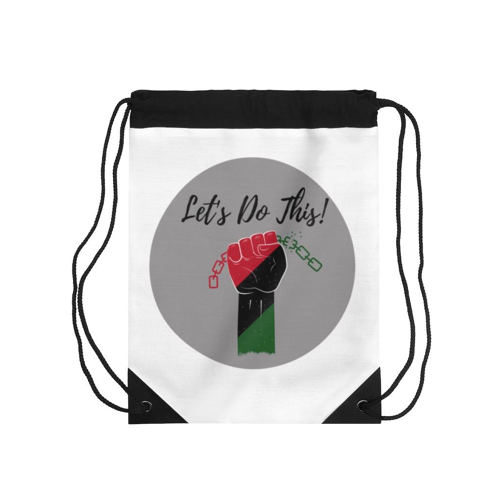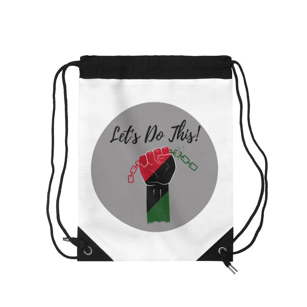 Functional and eye-catching! Thinking of a quick trip to the gym, store or beach? Strap on this drawstring gym bag as it gives a nod to the work done and the work ahead. The perfect affirmation of Juneteenth's purpose and the perfect storage system for those quick hops and light travels when you don’t feel like carrying a lot of excess items. Get the jump on your friends by owning your bag first and wear it to that celebration. Happy Juneteenth!