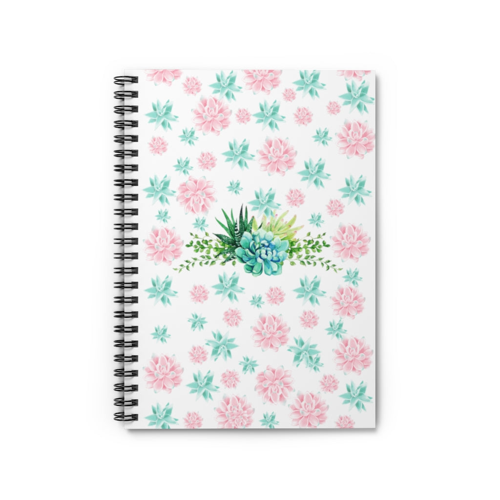 Store your thoughts, ideas, lists, poems, future plans and more within this 118 page spiral notebook with a soothing Pink and Green Succulents print design, on the front cover. Keep it by your side to catch those inspired thoughts as they come. Your new best friend. Makes a great gift too!