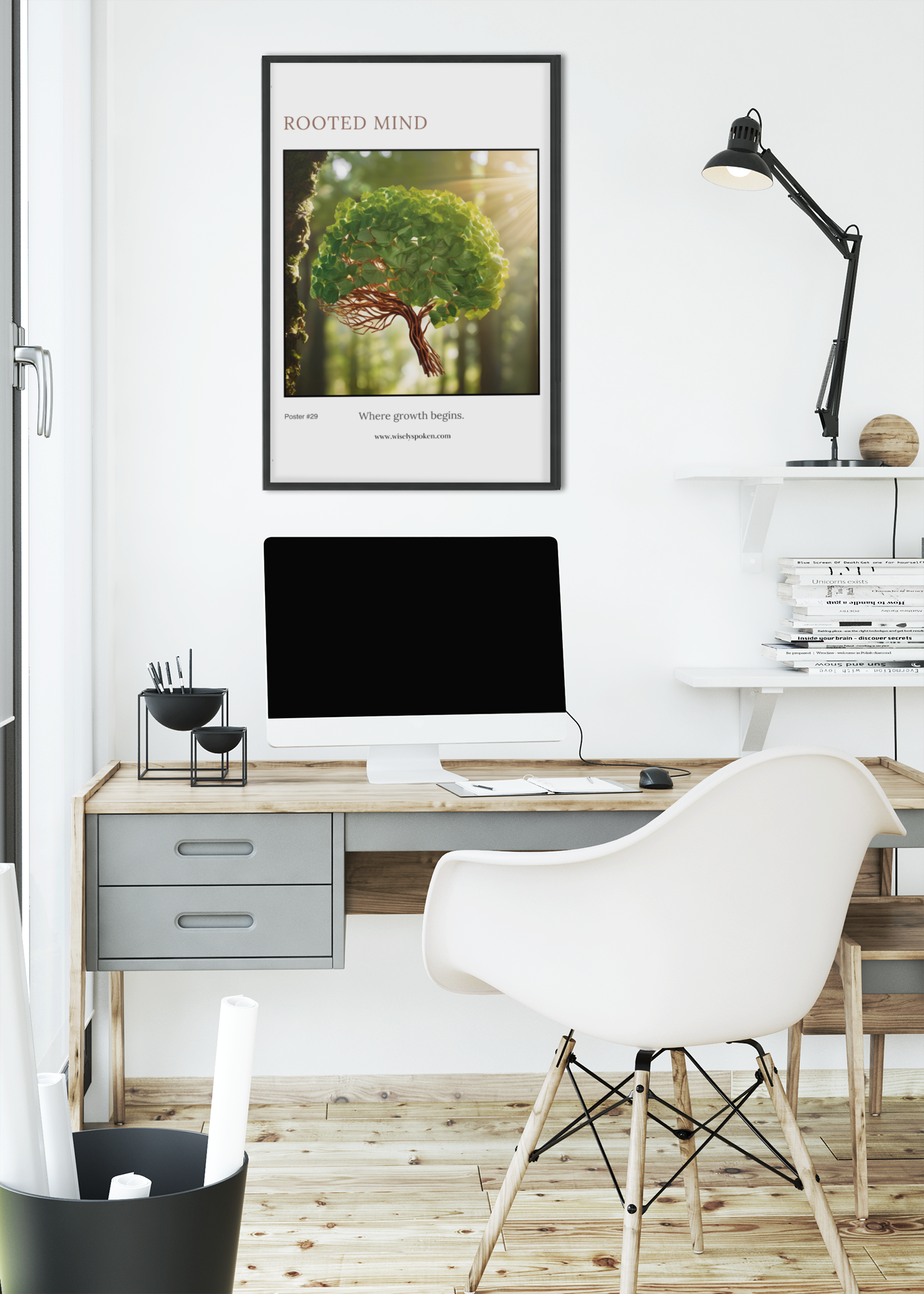 Perfect for therapy offices, counseling rooms, classrooms, coaching spaces, or home offices, this piece offers a calming yet intellectually inspiring presence. The earthy tones and soft forest light create a grounded, reflective atmosphere while reinforcing the message: growth begins with strong roots.